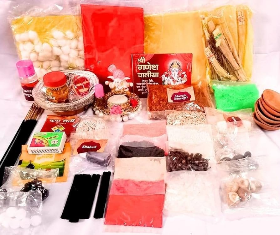 Puja samagri, sweets, decor elements